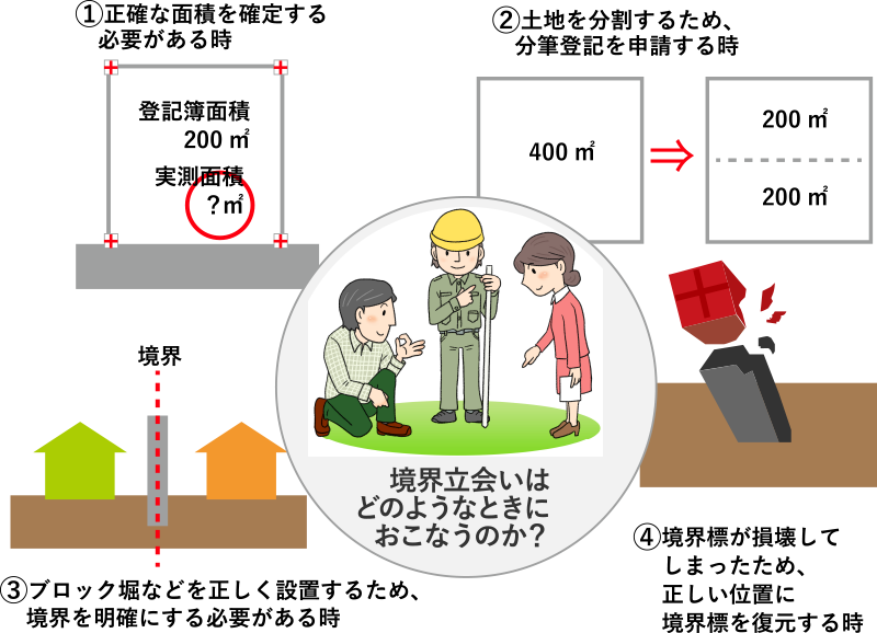 土地の売買や、相続のときなど、売買契約の成立条件として「土地面積の確定」「境界の確認」が必須とされる為「境界立会い」が必要となります。時間にして10から15分(土地の広さによって変動あり)くらいです。事前に現地にてご挨拶・ご説明をします〈ご不在の場合には封書を投函し後日ご案内の封筒を送付します〉境界立会いをしておくとお互いの利益になり、安心ができ、何より不動産の価値も上がると言われておりますので「境界立会い」に、ぜひご参加ください